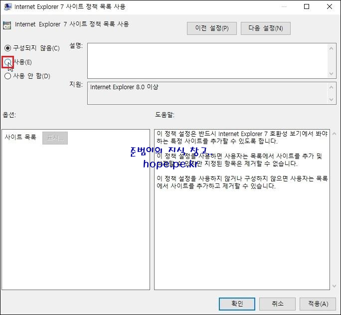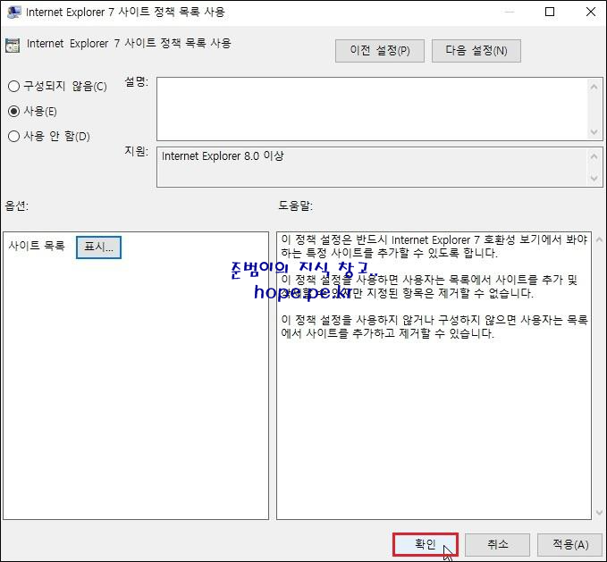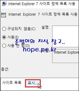 Internet Explorer 7 사이트 정책 목록 사용 창에서, '사용' 을 클릭 합니다.