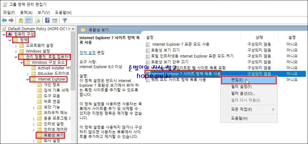 그룹 정책 관리 편집기 콘솔이 실행되면, '컴퓨터 구성 > 정책 > 관리 템플릿 > Windows 구성 요소 > Internet Explorer > 호환성 보기 > Internet Explorer 7 사이트 정책 목록 사용' 에서 우클릭후 '편집' 을 클릭 합니다.