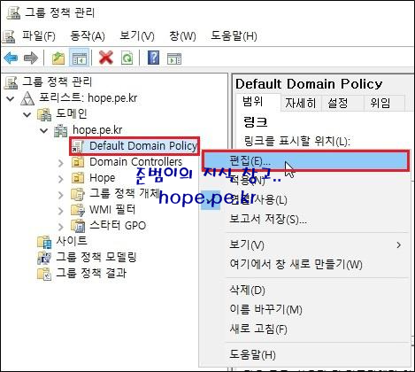 그룹 정책 관리 콘솔이 실행되면, '포리스트 > 도메인 > 도메인 이름 > Default Domain Policy' 에서 우클릭후 '편집' 을 클릭 합니다.