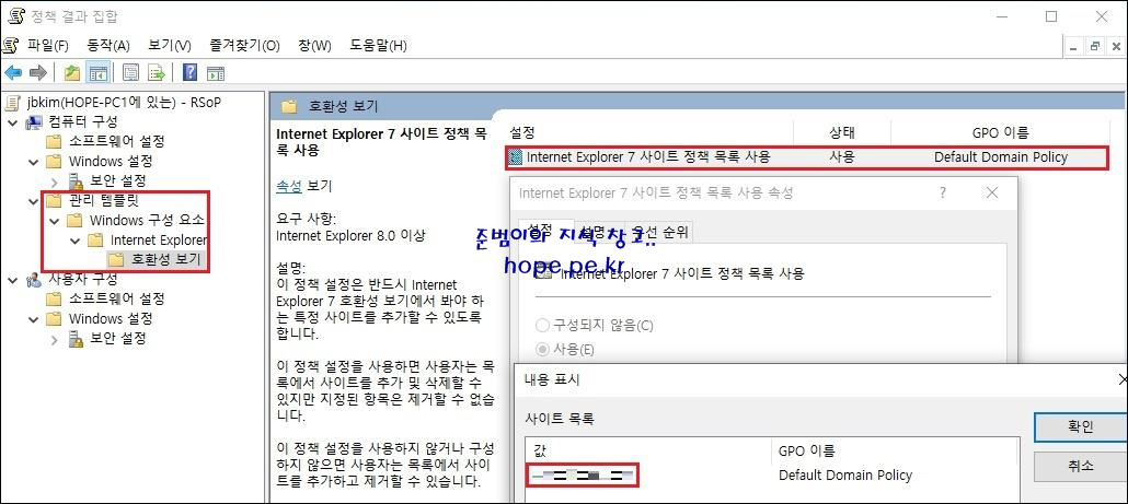 정책 결과 집합 창에서, 방금 생성한 그룹 정책이 클라이언트에 잘 적용 되었음을 확인할 수 있습니다.