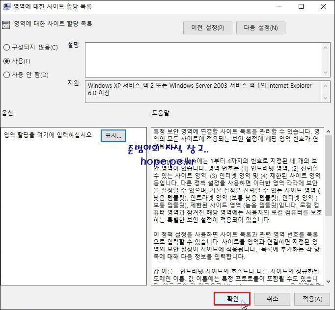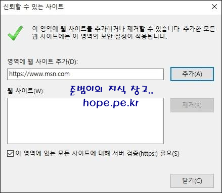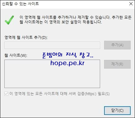 그리고 '신뢰할 수 있는 사이트' 창에 그룹 정책의 레지스트리로 등록한 사이트가 표시되지는 않습니다. 또한 사용자가 신뢰할 수 있는 사이트를 자유롭게 설정할 수 있습니다.