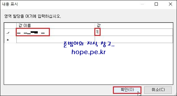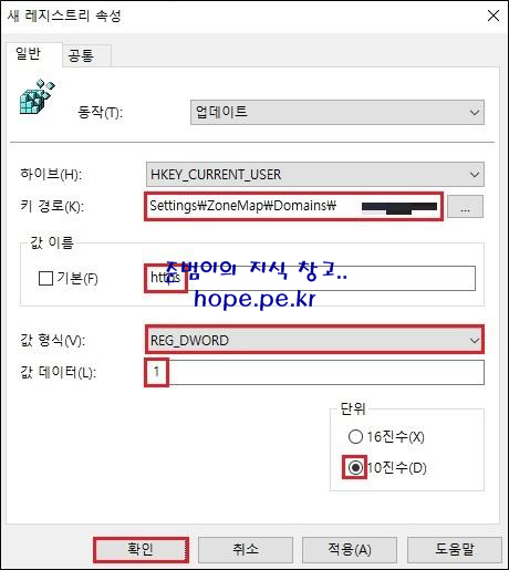 새 레지스트리 속성 창에서, 다음 스샷과 같이 설정후 '확인' 을 클릭 합니다.
