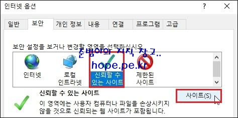 '신뢰할 수 있는 사이트' 클릭후 '사이트'를 클릭 합니다.