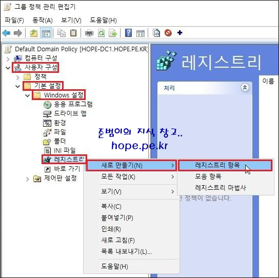 그룹 정책 관리 편집기 콘솔의 '사용자 구성 > 기본 설정 > Windows 설정 > 레지스트리' 에서 우클릭후 '새로 만들기 > 레지스트리 항목' 을 클릭 합니다.