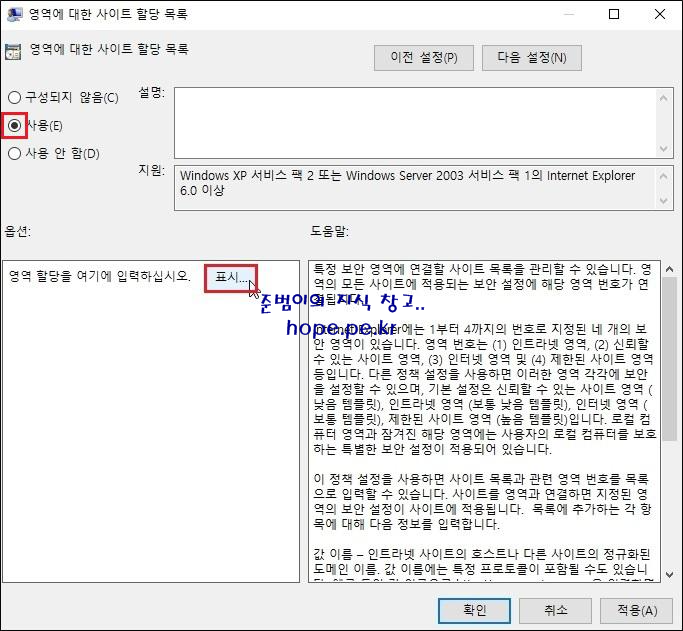 영역에 대한 사이트 할당 목록 창에서, '사용' 을 클릭후 '표시' 를 클릭 합니다.