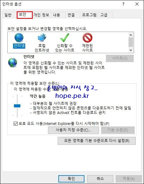 인터넷 옵션 창의 보안 탭 화면 입니다.