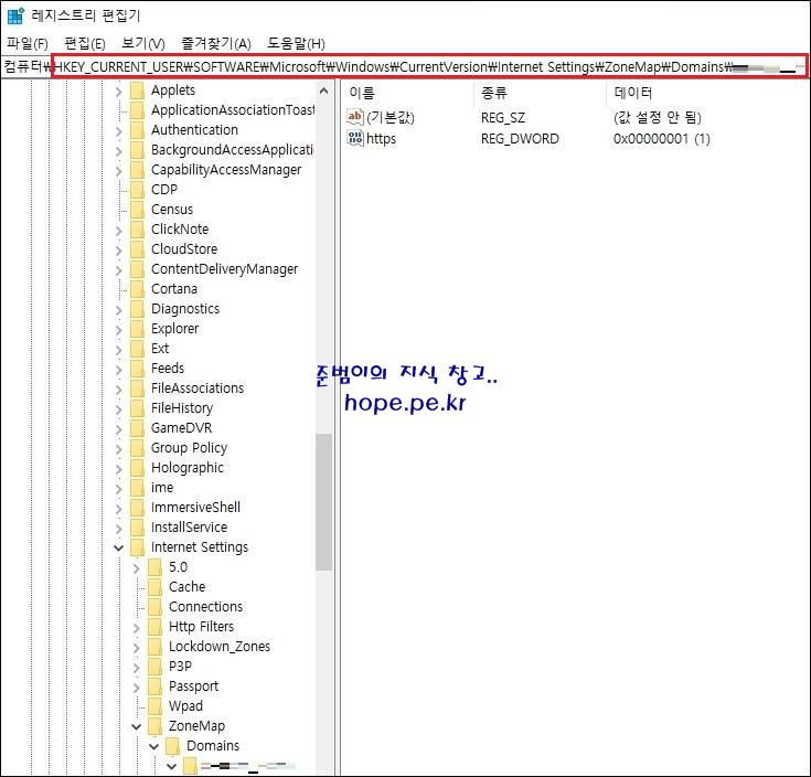 ▶ 키 경로: 'HKEY_CURRENT_USER\Software\Microsoft\Windows\CurrentVersion\Internet Settings\ZoneMap\Domains\URL'