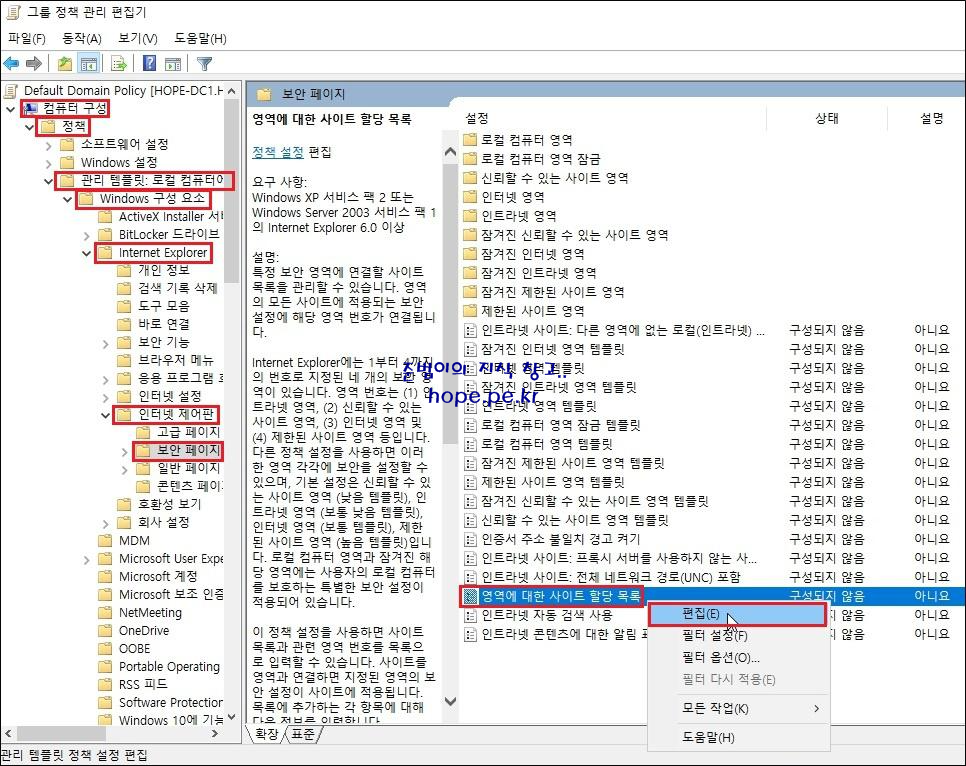 그룹 정책 관리 편집기 콘솔이 실행되면, '컴퓨터 구성 > 정책 > 관리 템플릿 > Windows 구성 요소 > Internet Explorer > 인터넷 제어판 > 보안 페이지 > 영역에 대한 사이트 할당 목록' 에서 우클릭후 '편집' 을 클릭 합니다.