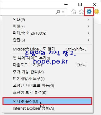 Internet Explorer 11 실행후 '도구 > 인터넷 옵션' 을 클릭합니다.