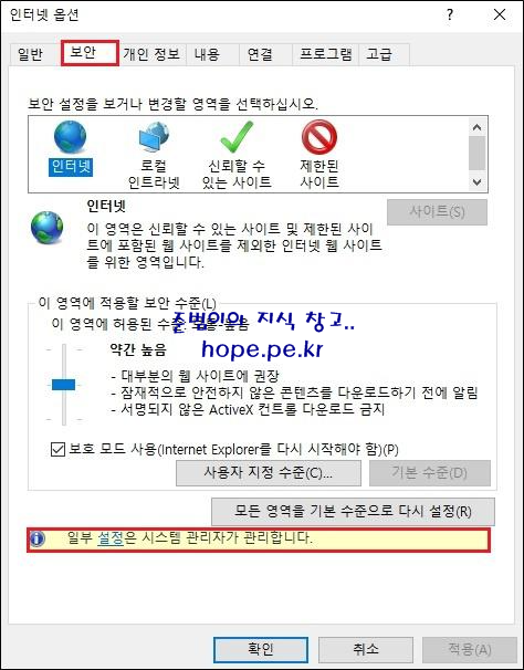 인터넷 옵션 창에서, '보안' 탭으로 이동해보면 다음과 같이 '일부 설정은 시스템 관리자가 관리합니다.' 메세지가 표시됩니다.
