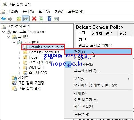 그룹 정책 관리 콘솔이 실행되면, '포리스트 > 도메인 > 도메인 이름 > Default Domain Policy' 에서 우클릭후 '편집' 을 클릭 합니다.
