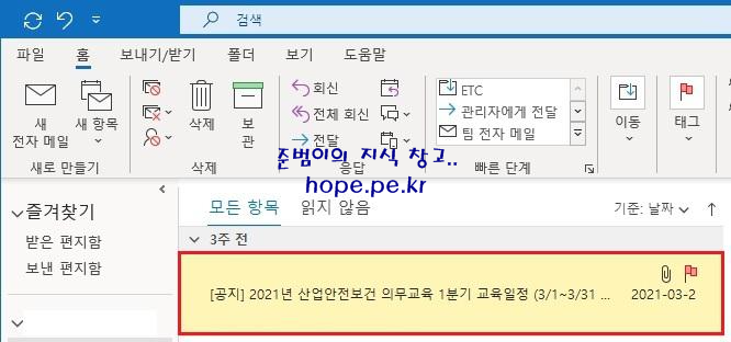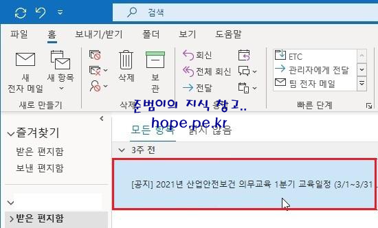 약간의 시간 경과 후 방금전에 Outlook에서 플래그 지정한 메일을 확인할 수 있습니다. 해당 메일을 클릭 합니다.