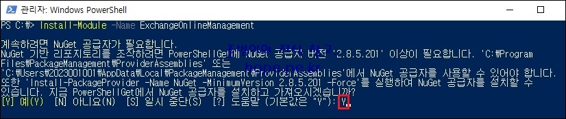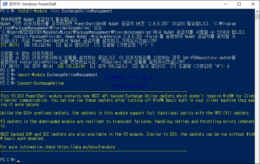 프롬프트가 떨어지면, ExchagneOnlineManagement 모듈이 정상적으로 설치 완료된 것 입니다.