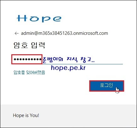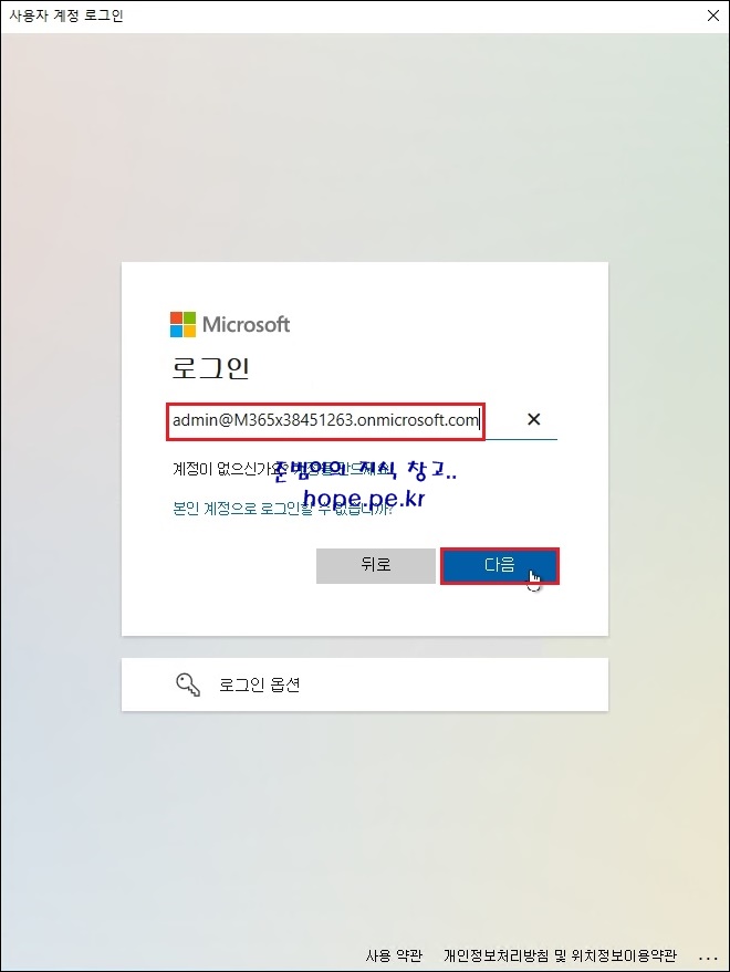 사용자 계정 로그인 창에서, '관리자 계정' 입력 후 '다음' 을 클릭 합니다.
