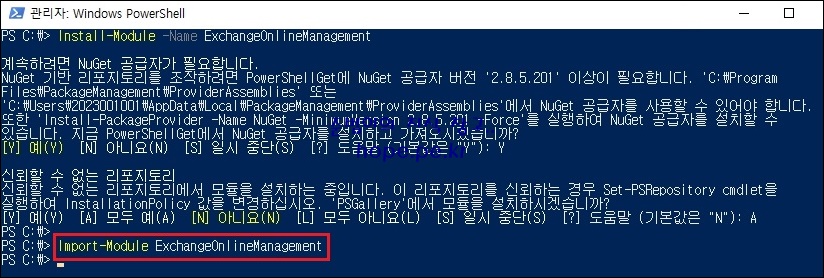 다음 cmdlet 을 실행하여 설치한 ExchagneOnlineManagement 모듈을 가져옵니다.