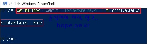 참고로 Exchange Online PowerShell에서, 다음 cmdlet 명령어로 보관 사서함의 사용 여부를 확인할 수 있습니다.