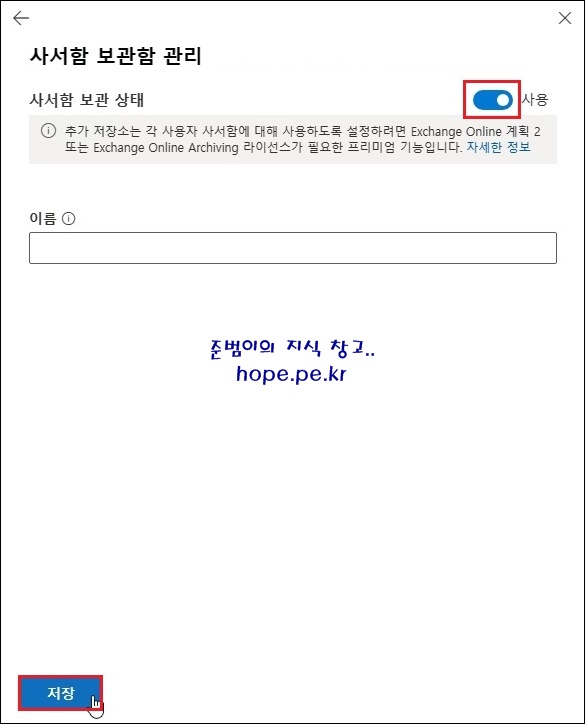 보관 사서함을 사용하기 위해서, '사용' 버튼을 클릭 후 '저장'을 클릭 합니다.