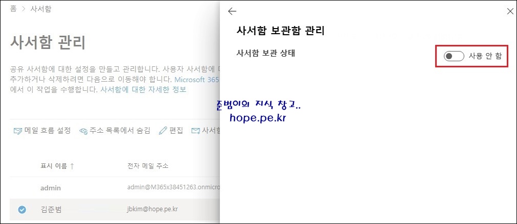 보관 사서함은 기본적으로 비활성화 되어 있기 때문에 관리자가 보관 사서함을 사용할 수 있도록 설정을해야 합니다.