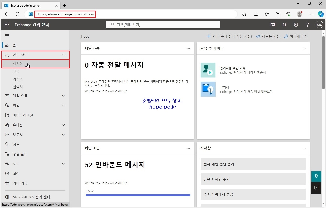 Exchagne 관리 센터(admin.exchange.microsoft.com) 접속 후, '받는 사람 > 사서함' 을 클릭 합니다.