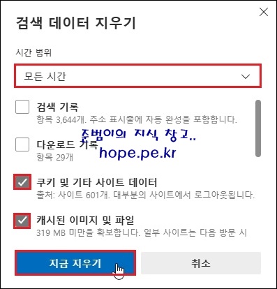 검색 데이터 지우기 상자에서, 시간 범위를 '모든 시간' 으로 선택 후 '쿠기 및 기타 사이트 데이터' 및 '캐시된 이미지 및 파일' 옵션에 체크 후 '지금 지우기' 를 클릭 합니다.