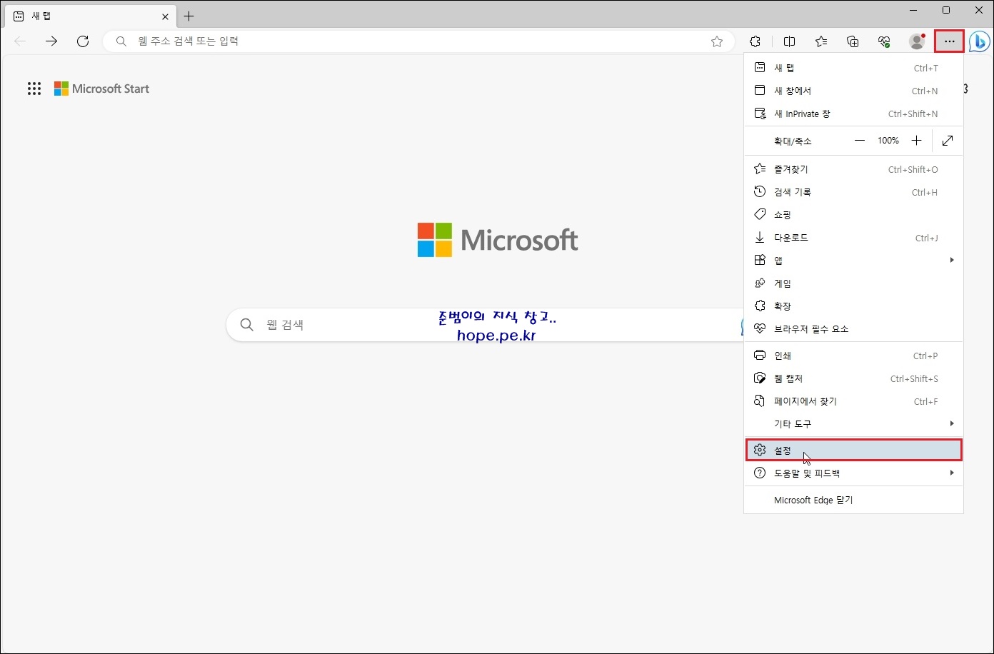 Microsoft Edge 브라우저 실행 후, 우측 상단의 '· · ·(설정 및 기타)' 버튼을 클릭 합니다.