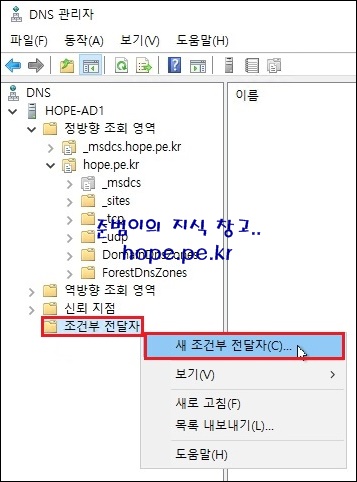 DNS 관리자 콘솔의 '조건부 전달자' 에서 우클릭 후 '새 조건부 전달자' 를 클릭 합니다.