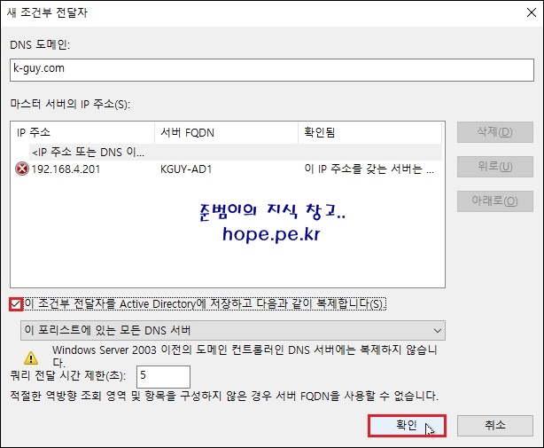 해당 IP에 대해 서버 FQDN을 정상적으로 불러오면, '이 조건부 전달자를 Active Directory에 저장하고 다음과 같이 복제합니다.' 옵션을 선택 후 '확인' 을 클릭 합니다.