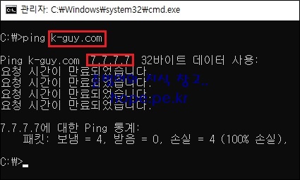 먼저 조건부 전달자 추가 전 조건부 전달자에 추가할 도메인 k-guy.com 에 대해 DNS 조회를 해보겠습니다.