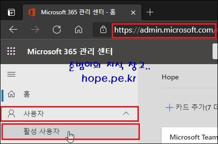 웹브라우저에서 Microsoft 365 관리 센터 (https://admin.microsoft.com)에 접속 후 ‘사용자 > 활성 사용자’ 를 클릭 합니다.