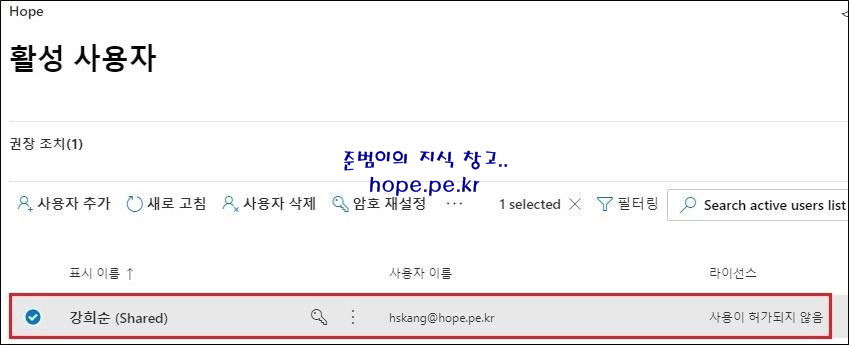 활성 사용자 화면에서, 해당 사용자의 ‘표시 이름’ 이 OOO (Shared)로 변경 되었고,’ 라이선스가’ 사용 허가되지 않음으로 변경 되었습니다.