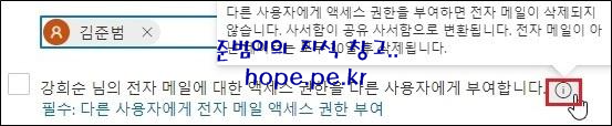 ‘OOO’ 님의 전자 메일에 대한 액세스 권한을 다른 사용자에게 부여합니다.’ 에 체크 후 ‘필수: 다른 사용자에게 전자 메일 액세스 권한 부여’ 를 클릭 합니다.