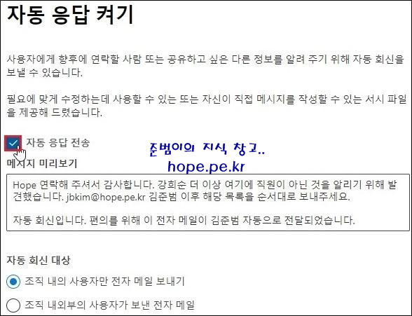 Cf) 삭제하는 사용자에게 메일을 발송하는 사람에게 응답 메일을 보내고자 하면 ‘자동 응답 전송’ 에 체크 후 원하는 설정을 진행하면 됩니다.
