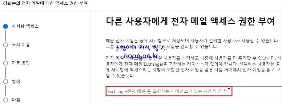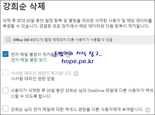 그리고 다른 사용자에게 전자 메일 액세스 권한 부여 도움말 입니다. (다른 사용자에게 액세스 권한을 부여하면 메일이 삭제되지 않고 사서함이 공유 사서함으로 변환됩니다. 메일이 아닌 데이터는 30일 후 삭제됩니다.)