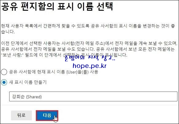 공유 편지함의 표시 이름 선택 화면에서, ‘새 표시 이름 만들기’ 선택 후 ‘새 이름 입력’ 후 ‘다음’ 을 클릭 합니다.