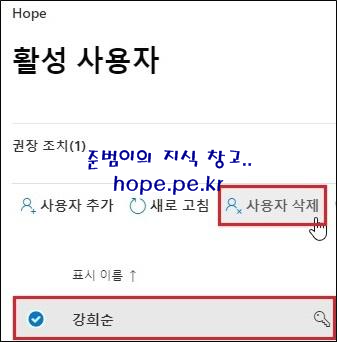 활성 사용자 화면에서, ‘삭제를 원하는 사용자’ 클릭 후 ‘사용자 삭제’ 를 클릭 합니다.
