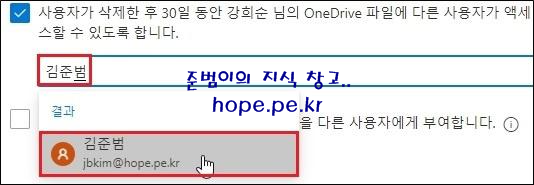 삭제하는 사용자의 OneDrive 파일에 엑세스 권한을 부여할 사용자 이름 입력 후 검색되는 ‘사용자’ 를 클릭 합니다.