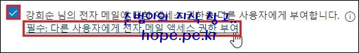 ‘OOO’ 님의 전자 메일에 대한 액세스 권한을 다른 사용자에게 부여합니다.’ 에 체크 후 ‘필수: 다른 사용자에게 전자 메일 액세스 권한 부여’ 를 클릭 합니다.