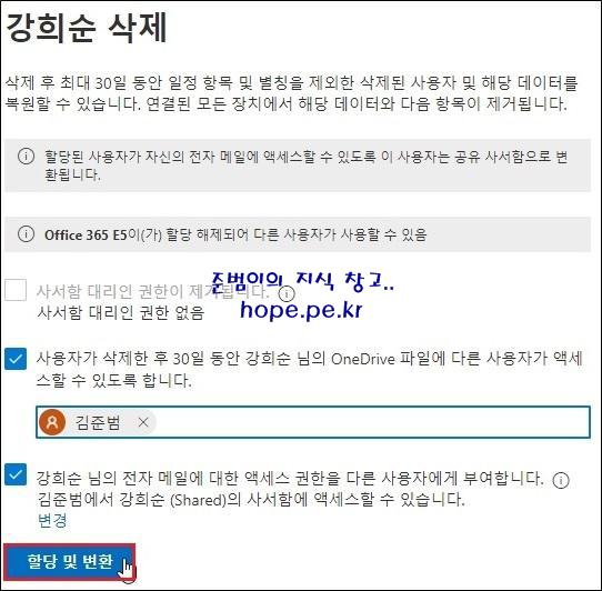 사용자 삭제 화면에서, ‘할당 및 변환’ 을 클릭 합니다.