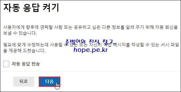 자동 응답 켜기 화면에서, ‘자동 응답 전송’ 을 체크 해제 후 '다음' 을 클릭 합니다.