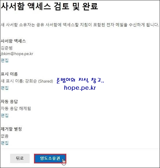 사서함 액세스 검토 및 완료 화면에서, 설정 확인 후 ‘양도 소유권’ 을 클릭 합니다.