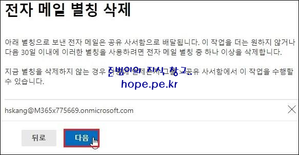 전자 메일 별칭 삭제 화면에서, 별칭 삭제 여부 확인 후 ‘다음’ 을 클릭 합니다.