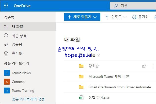 내 OneDrive 폴더 리스트가 보입니다. 저는 새 폴더에 삭제한 사용자 이름으로 새 폴더를 생성 후 데이터를 백업 받겠습니다. '새 폴더' 를 클릭 합니다.