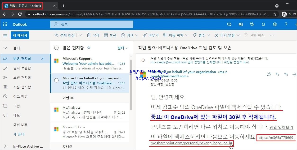 웹브라우저의 Outlook (https://outlook.office.com) 에 김준범 사용자로 로그인 하면, 아래와 같이 '작업 필요: 비즈니스용 OneDrive 파일 검토 및 보존' 메일을 수신 합니다. 수신한 메일에서 '이 파일에 엑세스하려면 다음으로 이동하세요.' 옆의 링크를 클릭 합니다.