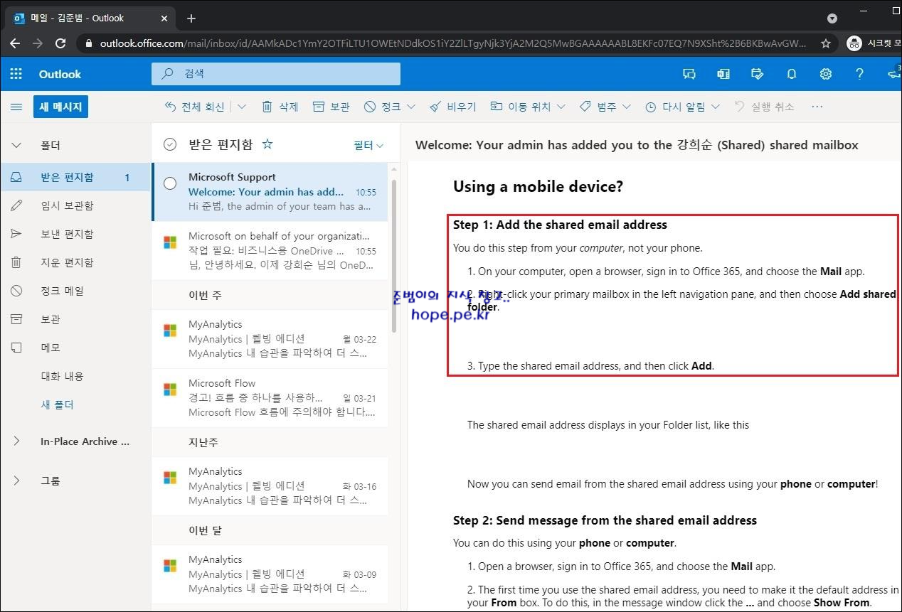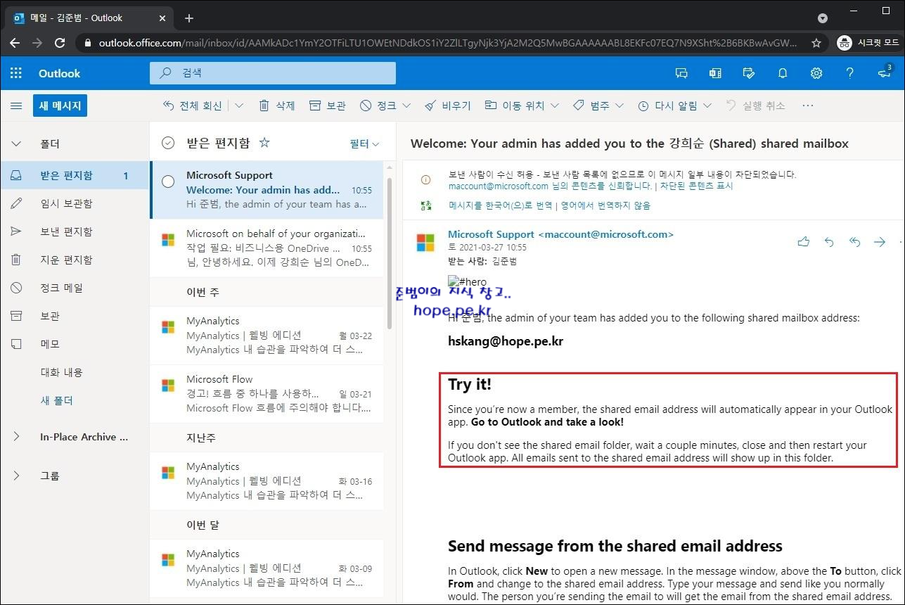 웹브라우저의 Outlook (https://outlook.office.com) 에 김준범 사용자로 로그인 하면, 아래와 같이 'Welcome: Your admin has added you to the 삭제한 사용자(Shared) shared mailbox' 메일을 수신 합니다. 수신한 메일에서 Outlook 앱에 공유 사서함이 자동으로 보인다는 내용을 확인할 수 있습니다.