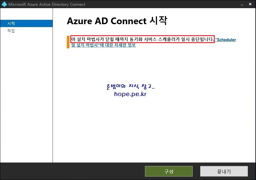 Microsoft Azure Active Directory Connect 마법사가 실행되면 다음과 같은 메세지를 확인할 수 있습니다.