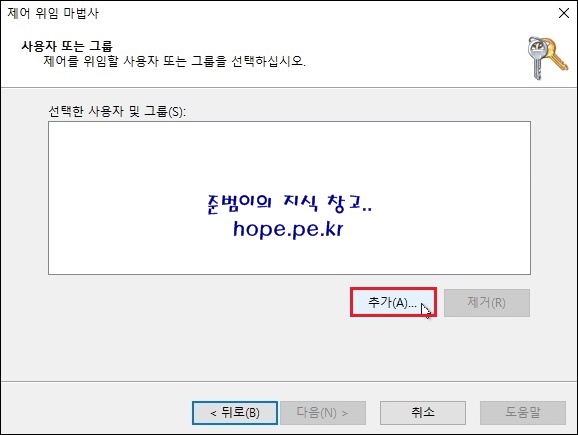 사용자 또는 그룹 화면에서, '추가' 를 클릭 합니다.