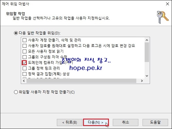 위임할 작업 화면에서, '도메인에 컴퓨터 가입시키기' 선택 후 '다음' 을 클릭 합니다.