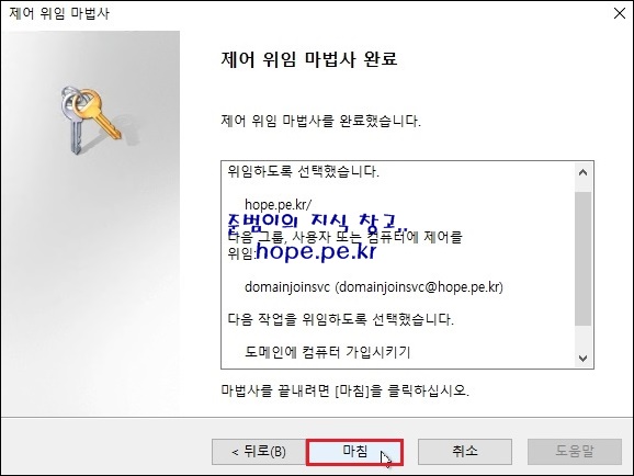제어 위임 마법사 완료 화면에서, '마침' 을 클릭 합니다.