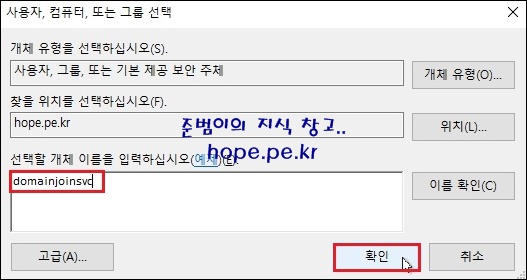 사용자, 컴퓨터, 또는 그룹 선택 창에서, '도메인 가입 권한을 부여할 계정' 입력 후 '확인' 을 클릭 합니다.