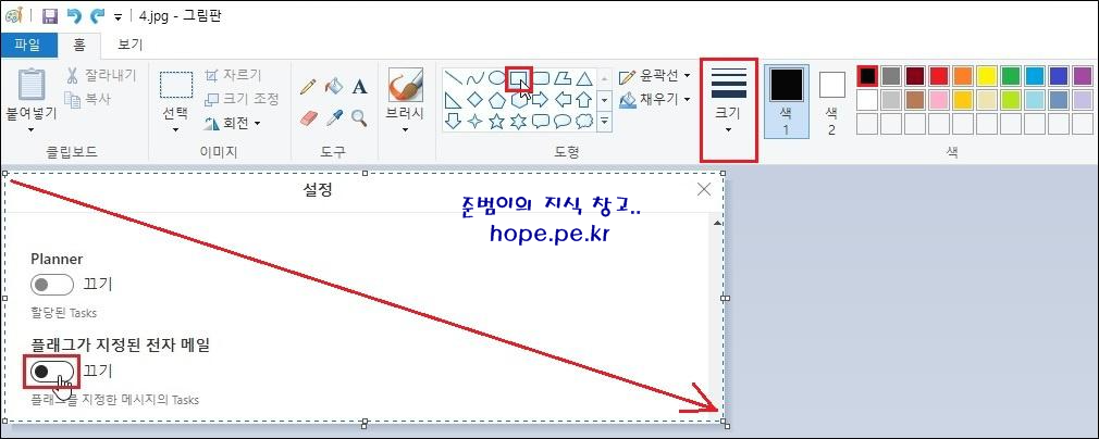 '그림판' 실행 후 '도형: 직사각형 > 크기 지정 > 색상 지정' 후 이미지의 왼쪽 상단에서 우측 하단까지 드래그 앤 드랍으로 테두리 영역을 지정 합니다.